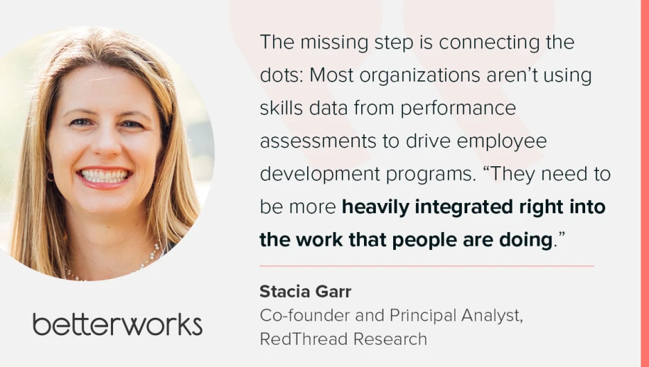 The missing step is connecting the dots: Most organizations aren’t using skills data from performance assessments to drive employee development programs. “They need to be more heavily integrated right into the work that people are doing,” Stacia explained.