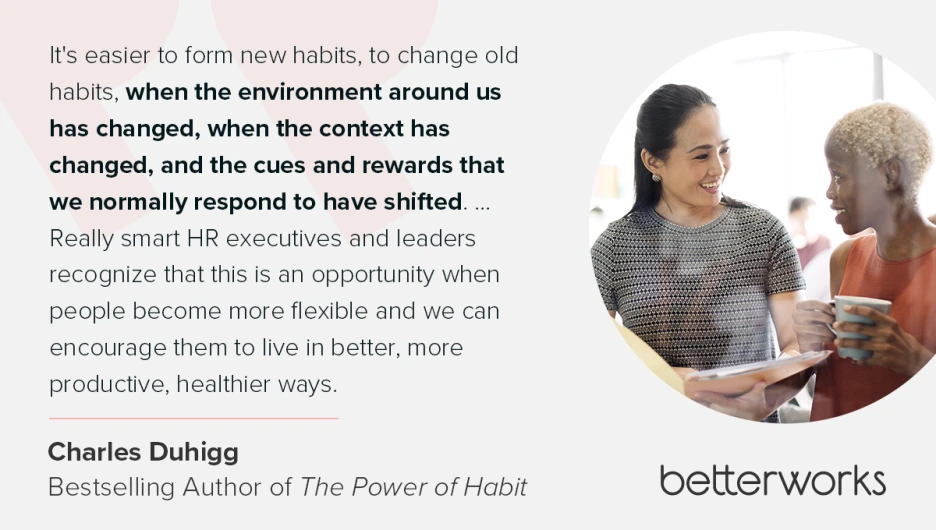 Disruption creates the perfect moment to rethink workplace habits. When the environment around us changes, our routines and behaviors can’t help but shift, too. “During times of significant change, one of the things that happens is that habits tend to become destabilized,” Charles says. “So it's easier to form new habits, to change old habits, when the environment around us has changed, when the context has changed, and the cues and rewards that we normally respond to have shifted.”