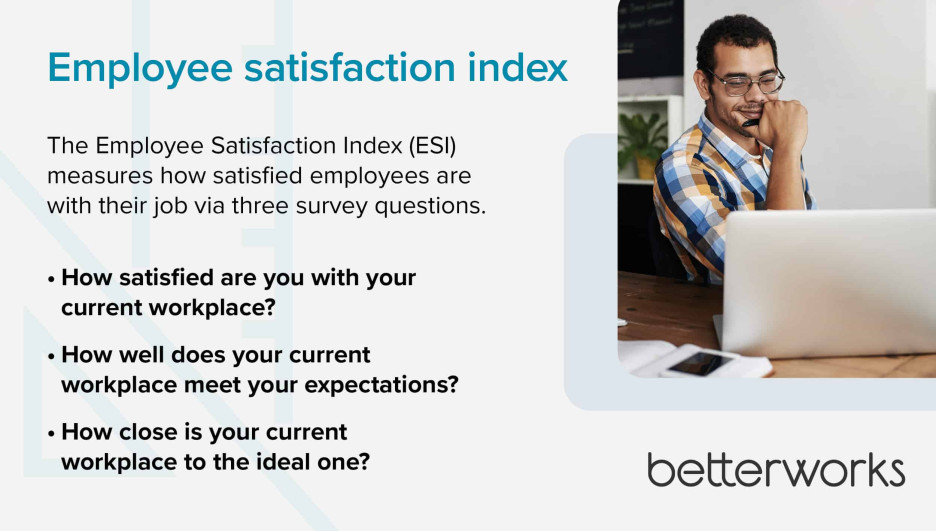 The Employee Satisfaction Index (ESI) measures how satisfied employees are with their job via three survey questions. These questions can also be asked as part of a longer survey.