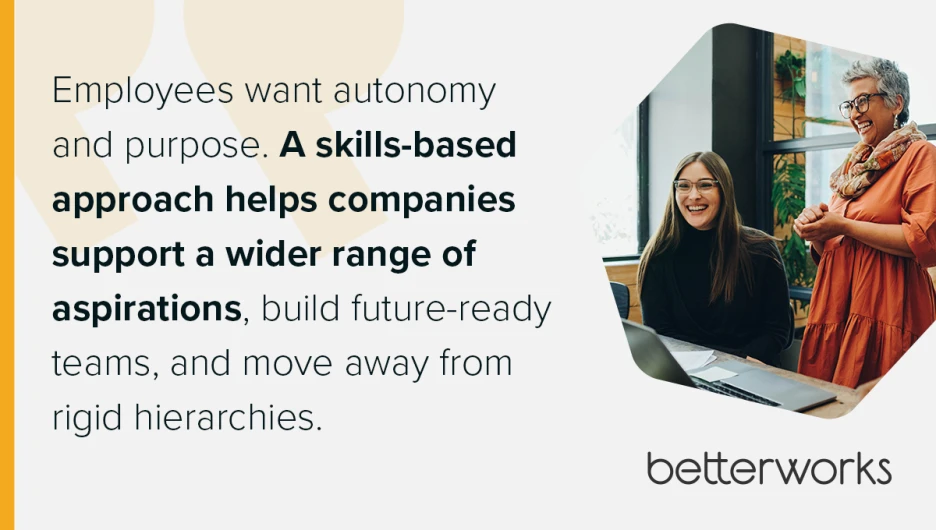This mindset shift reflects a broader movement among organizations: growth isn’t one-size-fits-all. Employees want autonomy and purpose. A skills-based approach helps companies support a wider range of aspirations, build future-ready teams, and move away from rigid hierarchies.