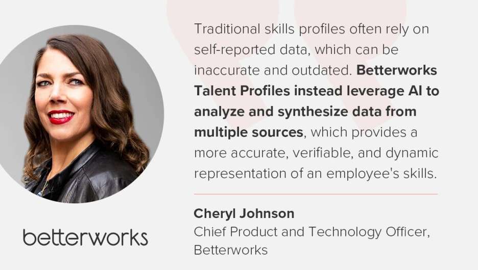 This innovation is particularly crucial as more organizations shift toward skills-based hiring and development. “Traditional skills profiles often rely on self-reported data, which can be inaccurate and outdated,” explains Cheryl Johnson, chief product and technology officer at Betterworks. “Betterworks Talent Profiles instead leverage AI to analyze and synthesize data from multiple sources, which provides a more accurate, verifiable, and dynamic representation of an employee's skills.”