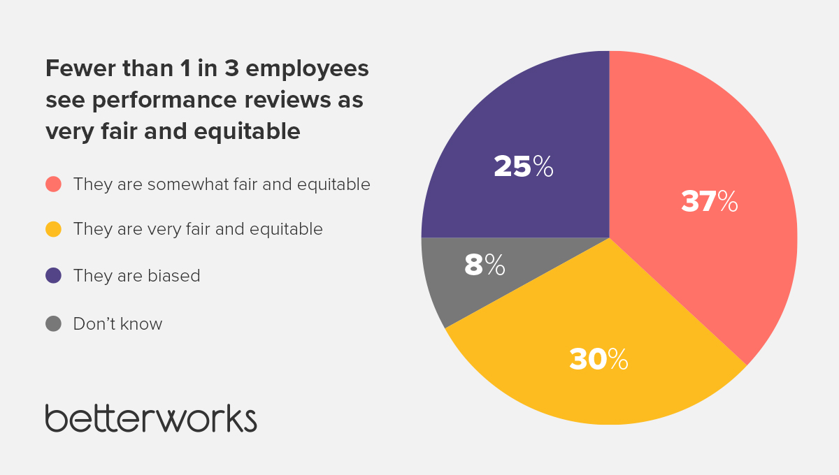 Unfortunately, the performance review often suffers from conscious or unconscious biases, such as recency bias, affinity bias, or the halo and horns effect. Betterworks’ 2023 research revealed that only 30% of employees feel performance reviews are “very fair and equitable,” 37% feel they are “somewhat fair and equitable,” and a quarter believe they are biased (another 8% “don’t know”).