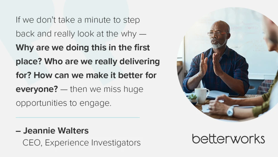 Understanding the purpose behind developing better experiences helps you take a more targeted approach to designing and deploying them. “If we don't take a minute to step back and really look at the why — Why are we doing this in the first place? Who are we really delivering for? How can we make it better for everyone? — then we miss huge opportunities to engage,” Jeannie said.