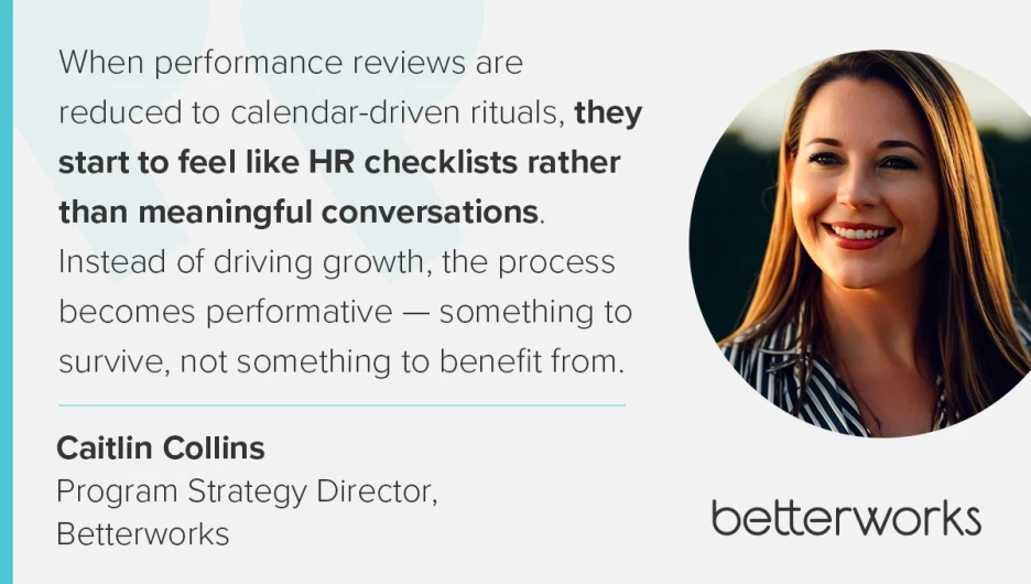 “When performance reviews are reduced to calendar-driven rituals, they start to feel like HR checklists rather than meaningful conversations,” says Caitlin Collins, program strategy director at Betterworks. Managers may default to filling out forms or copying generic phrases, and employees start preparing answers they think they're "supposed" to give. “Instead of driving growth, the process becomes performative — something to survive, not something to benefit from,” Caitlin explains.