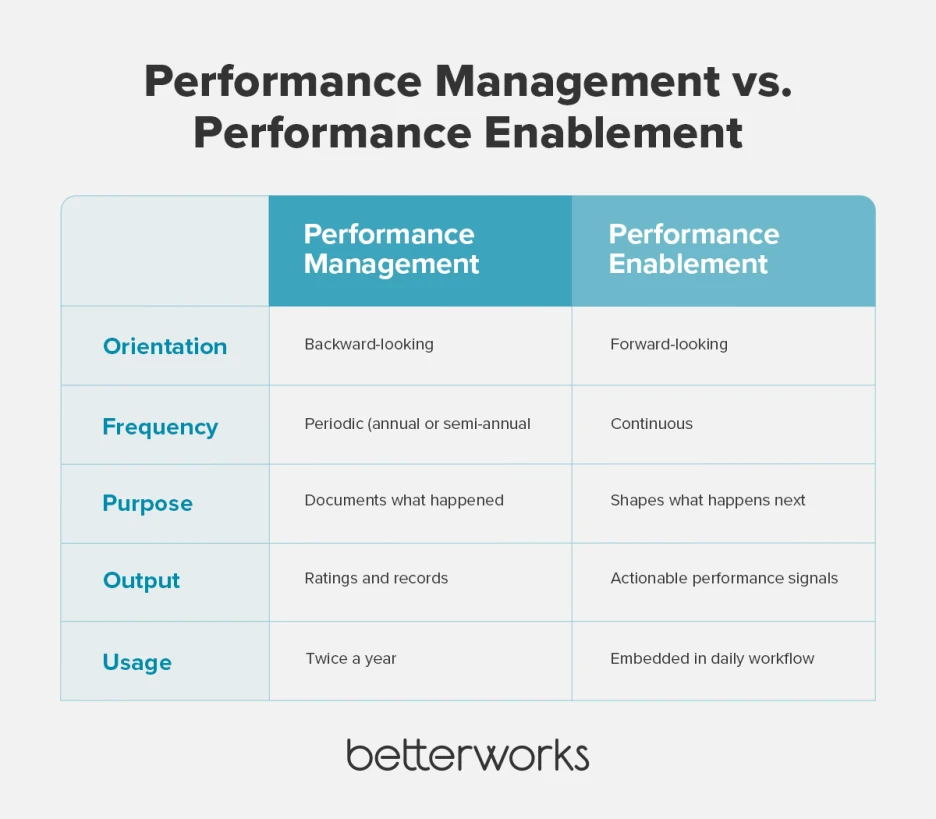 Performance management is a periodic, compliance-driven process for evaluating what employees have done. Performance enablement is a continuous system for generating the signals that help leaders guide what happens next. The distinction matters because the data each produces is fundamentally different in frequency, depth, and usefulness — and those differences compound. Organizations running annual reviews fall further behind every year they don't change.