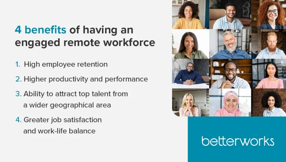 One of the biggest advantages of engaging a remote workforce is that it can help you retain your best employees. Engaged employees are more invested in their work and the team. And when your employees feel valued and supported, they're more likely to stick around — even if they have high earning potential elsewhere.