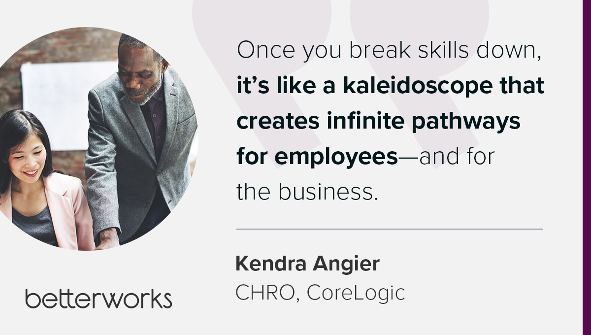 Kendra is taking a similarly fluid approach at CoreLogic. Her team started with a taxonomy and a global job architecture, but they’re already moving beyond static role definitions. “Once you break skills down, it’s like a kaleidoscope,” she said. That creates infinite pathways for employees—and for the business.