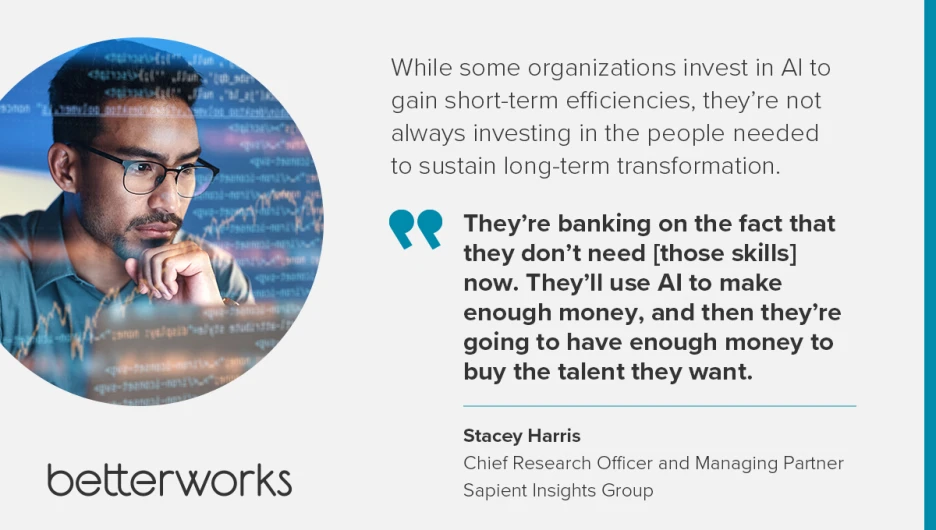 This approach shifts the focus from chasing tools to preparing the workforce. The nature of work itself is rapidly changing. Stacey noted that while some organizations invest in AI to gain short-term efficiencies, they’re not always investing in the people needed to sustain long-term transformation. “They’re banking on the fact that they don’t need [those skills] now,” she says. “They’ll use AI to make enough money, and then they’re going to have enough money to buy the talent they want.”