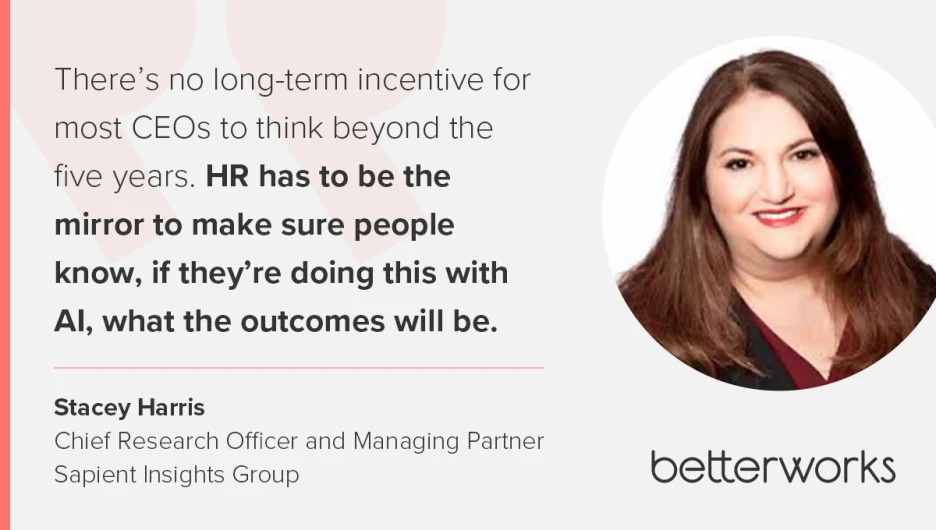 That means HR leaders need to show up differently. They must learn to speak the language of their cross-functional partners and clearly connect workforce strategy to business goals. “There’s no long-term incentive for most CEOs to think beyond the five years,” Stacey says. “HR has to be the mirror to make sure people know, if they’re doing this with AI, what the outcomes will be.”