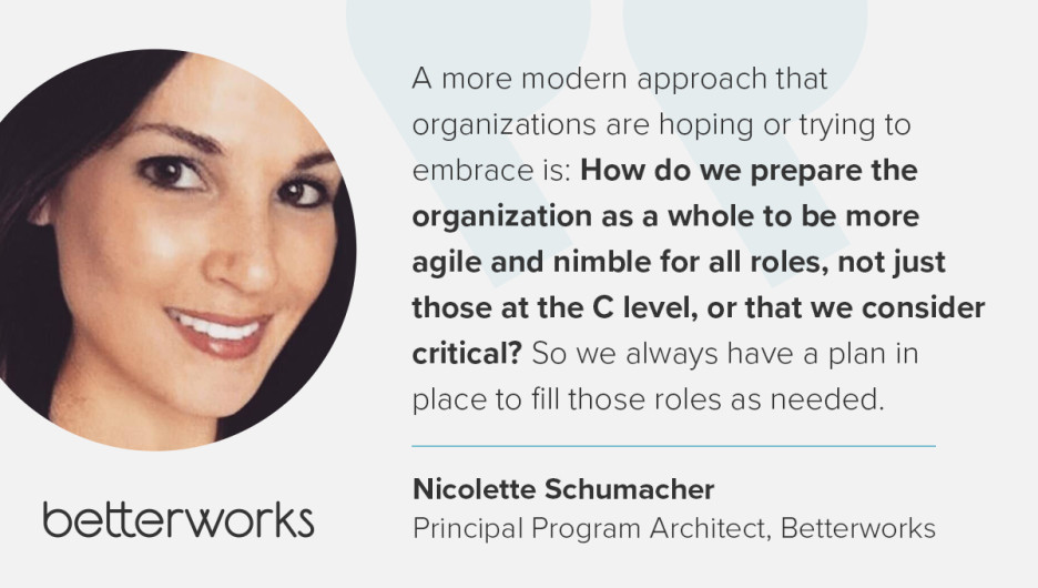 Traditionally, succession planning has focused on identifying top talent for senior leadership roles. But modern organizations are moving towards a more holistic and effective leadership succession planning approach, preparing for transitions at all levels of the organization. “I think it's merged a bit now, where we’re at today,” says Betterworks Principal Program Architect Nicolette Schumacher. “A more modern approach that organizations are hoping or trying to embrace is: How do we prepare the organization as a whole to be more agile and nimble for all roles, not just those at the C level, or that we consider critical? So we always have a plan in place to fill those roles as needed.”