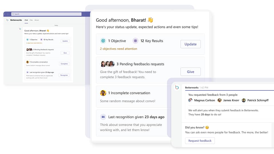 Within communications tools, such as Microsoft Outlook, Teams, and Gmail, managers and employees can quickly view and update their goals, schedule conversations, give or receive feedback, and offer recognition directly in the flow of work — in the applications they use every day. Integrations with third-party applications, including Excel, Salesforce, Jira, and Asana, allow updates to goal progress to happen without any intervention. For example, employees can connect sales or project targets in Excel 365 or Google Sheets to their key results milestones in Betterworks to save time and eliminate redundancy. In addition, milestone progress becomes part of a holistic performance management solution.