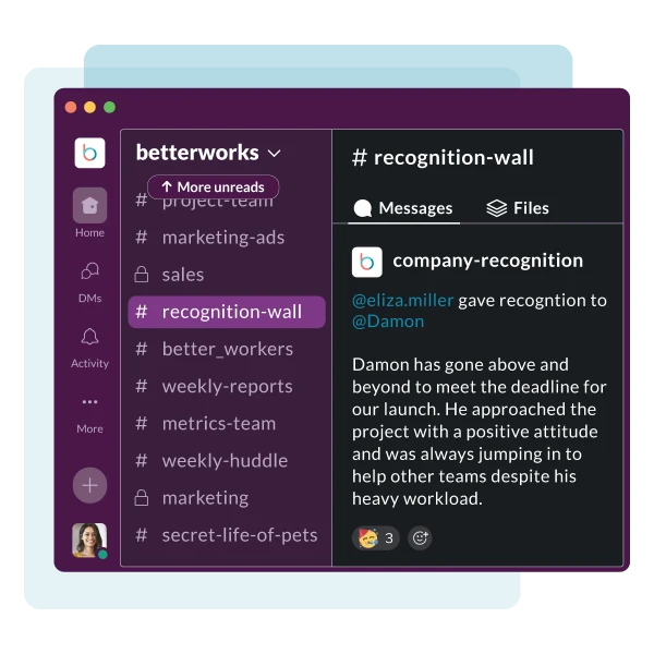 Capture feedback inside Slack, Microsoft Teams, Outlook, or Gmail. Nudges surface when it’s time to recognize employees or follow up on goals, keeping performance conversations frictionless for high-performing teams. Public praise tied to company values and OKRs appears in shared feeds, making wins visible and strengthening connection across the organization.